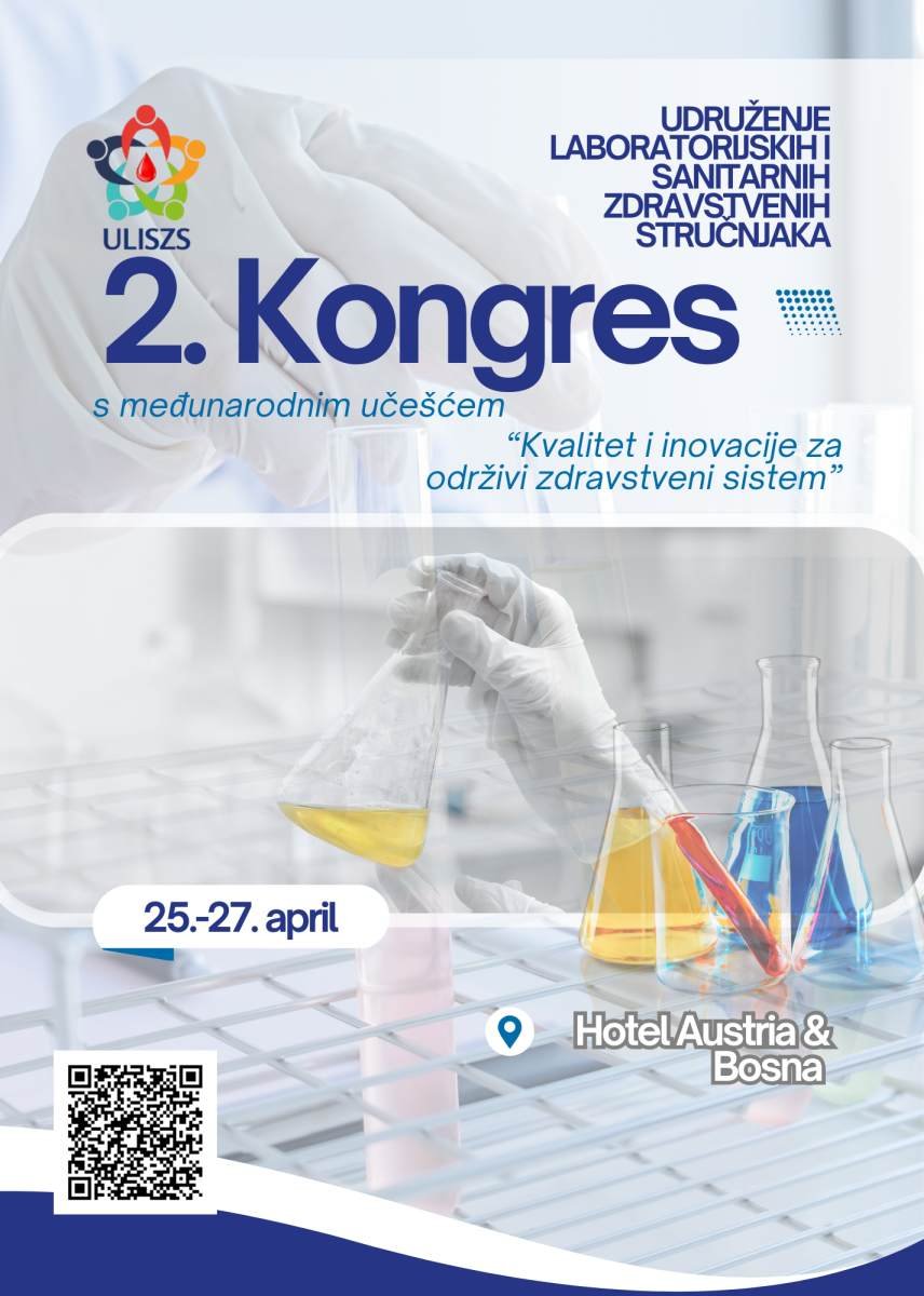 Obavještavamo javnost da će se od 25. do 27. aprila 2025. godine održati 2. Kongres s međunarodnim učešćem u organizaciji Udruženja laboratorijskih i sanitarnih zdravstvenih stručnjaka (ULISZS), pod nazivom “Kvalitet i inovacije za održivi zdravstveni sistem”.